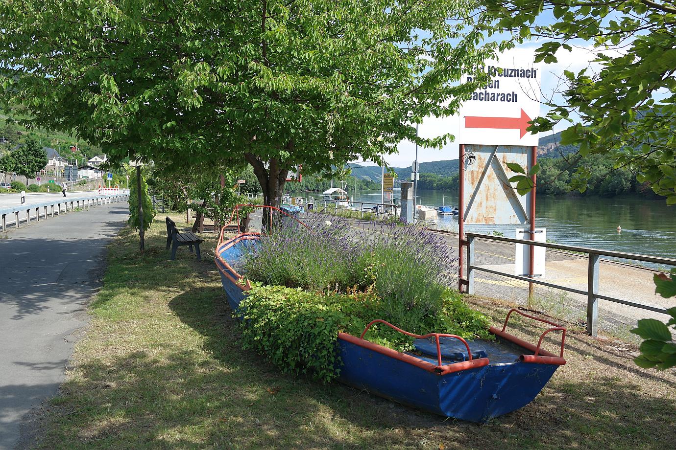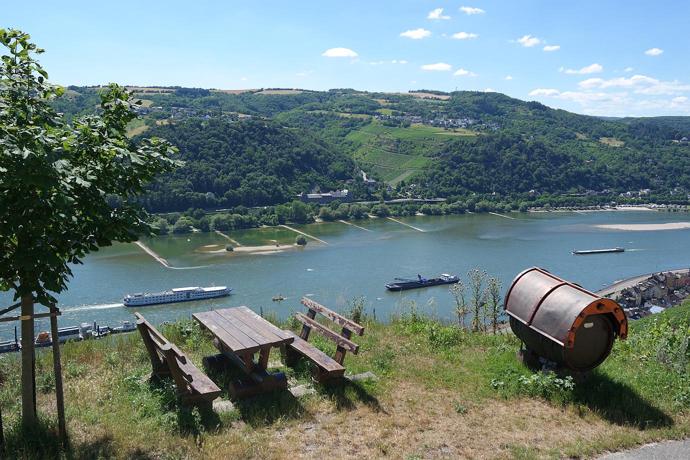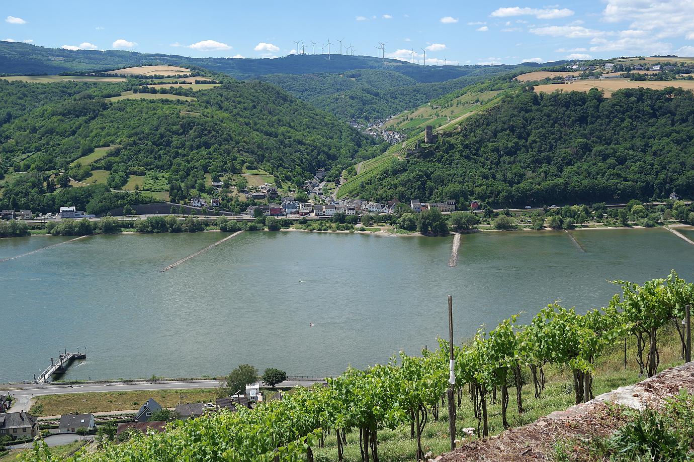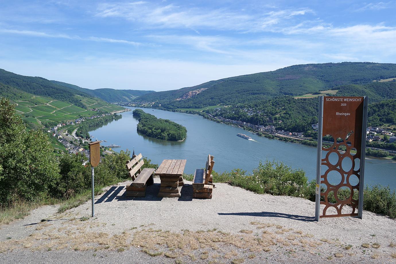 Nach einer Rast am ‚Rosenpavillion‘ geht es für mich wieder zurück nach Lorch. Noch einmal besuche ich die SCHÖNSTE WEINSICHT Rheingau 2020, um das Panorama auch bei Nachmittagssonne zu genießen. Von weitem ist auf dem Rhein die Autofähre zu sehen. Pausenlos überquert sie den Rhein – Hin und her.