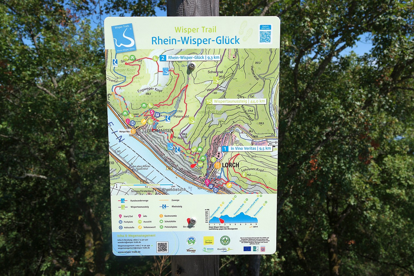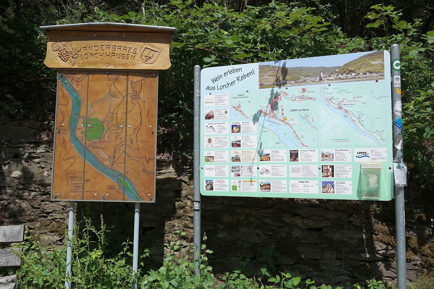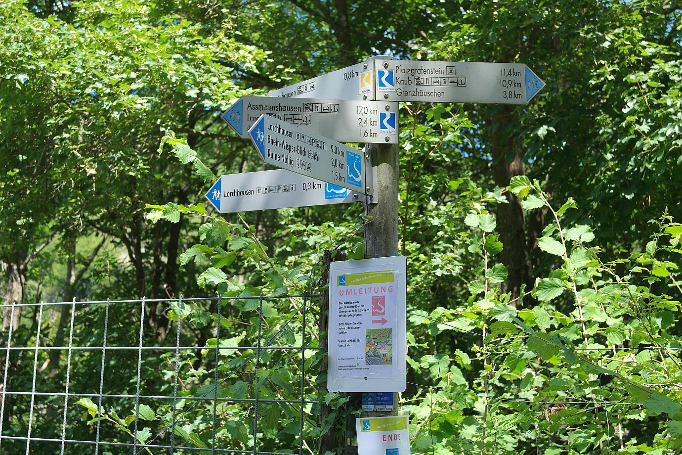 Ein wieder ein großer Wegweiser, der in alle Richtungen zeigt. Ein wahres Wanderparadies mit vielen möglichen Routen. Man kann in den Ort Lorchhausen hinuntergehen, oder über einen anderen Weg wieder zurück nach Lorch wandern. Wer gut zu Fuß ist, kann auch bis in das rund 11 Kilometer entfernte Kaub weiterwandern.