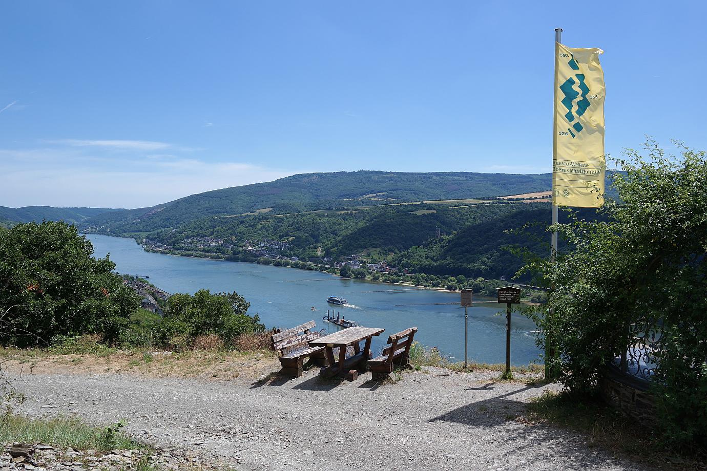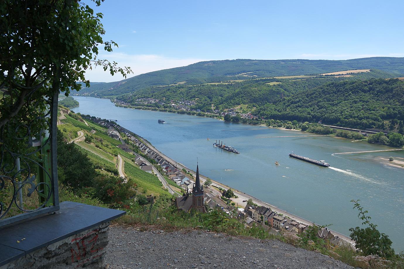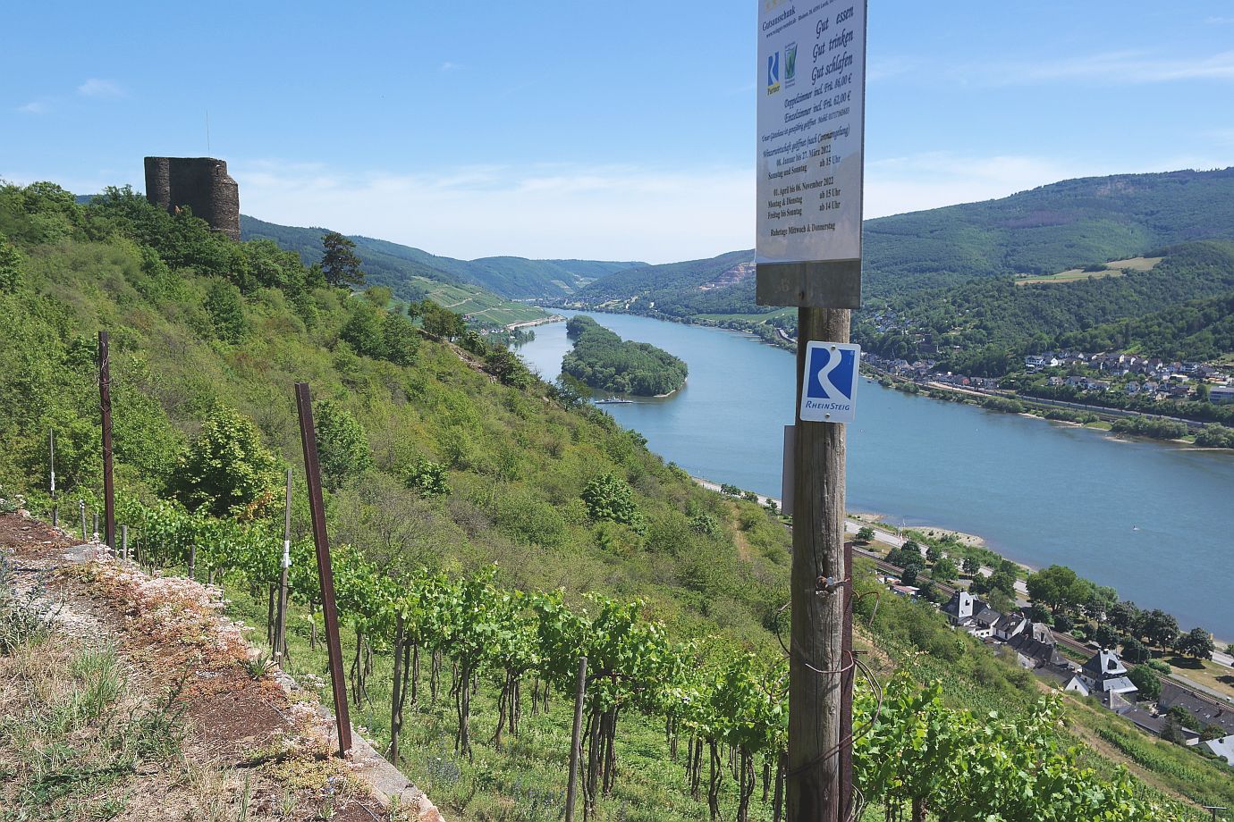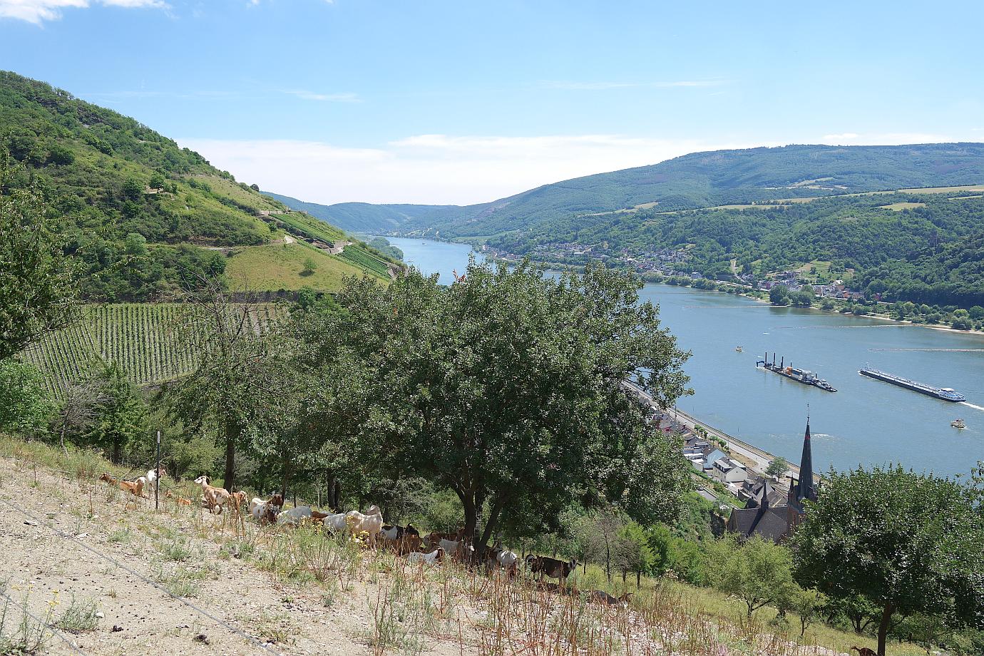 Ich werde meine Wanderung bis zum Aussichtspunkt ‚Rosenpavillion‘ fortsetzen. Vorbei geht es am ‚Blick zur Clemenskapelle‘ – diesmal von der gegenüberliegenden Hangseite aus zu sehen. Eine Herde Ziegen weidet am Hang im Schatten der Bäume. Mehrere Informationstafeln geben Aufschluss über Flora und Fauna am Rheinsteig. Und schon ist der Aussichtspunkt ‚Rosenpavillion‘ erreicht. Ein Blick schöner als der andere hier am Rheinsteig.