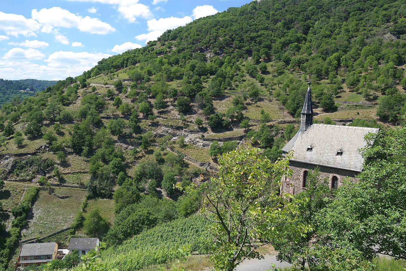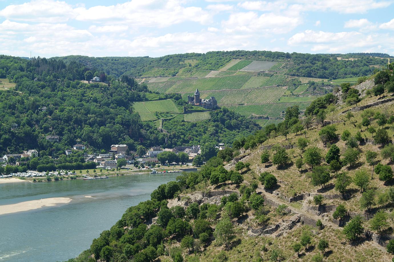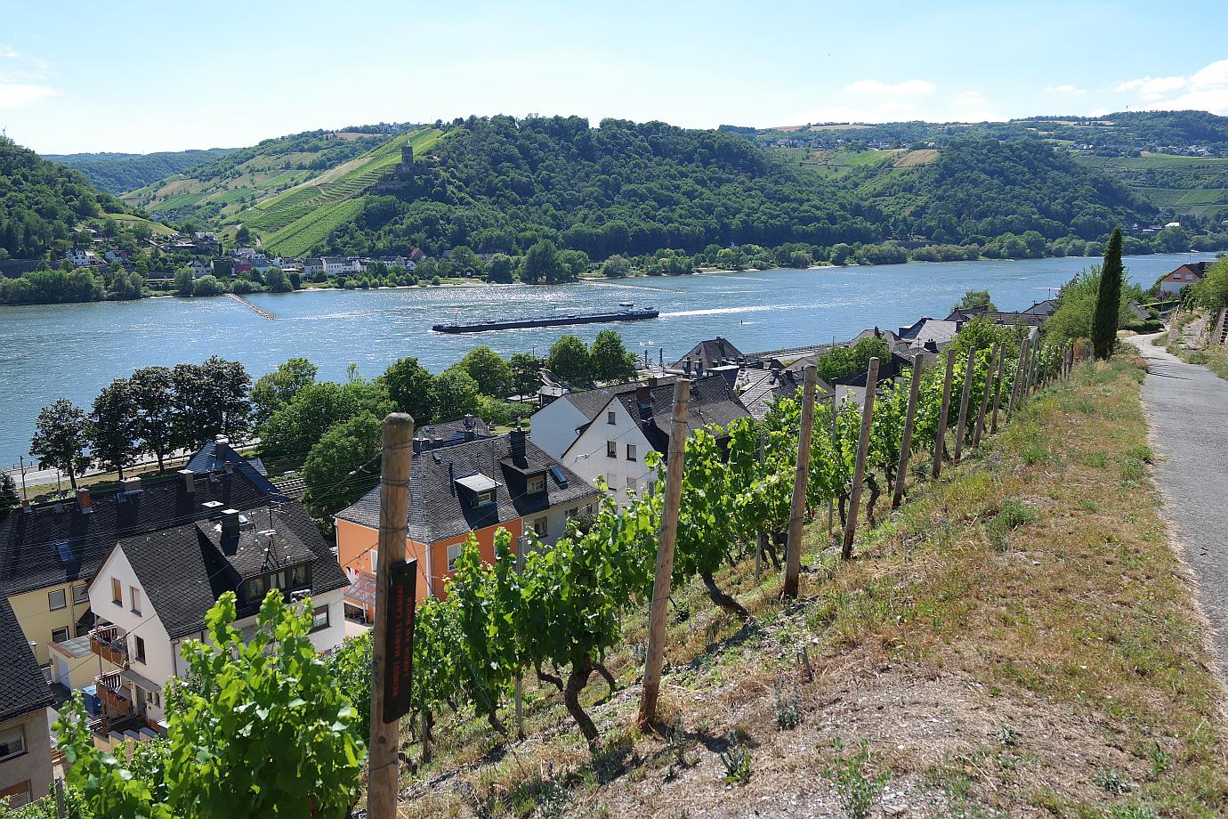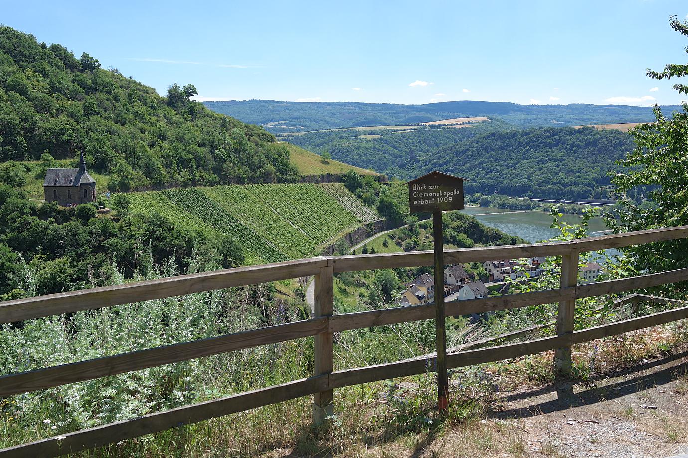 Ich werde meine Wanderung bis zum Aussichtspunkt ‚Rosenpavillion‘ fortsetzen. Vorbei geht es am ‚Blick zur Clemenskapelle‘ – diesmal von der gegenüberliegenden Hangseite aus zu sehen. Eine Herde Ziegen weidet am Hang im Schatten der Bäume. Mehrere Informationstafeln geben Aufschluss über Flora und Fauna am Rheinsteig. Und schon ist der Aussichtspunkt ‚Rosenpavillion‘ erreicht. Ein Blick schöner als der andere hier am Rheinsteig.