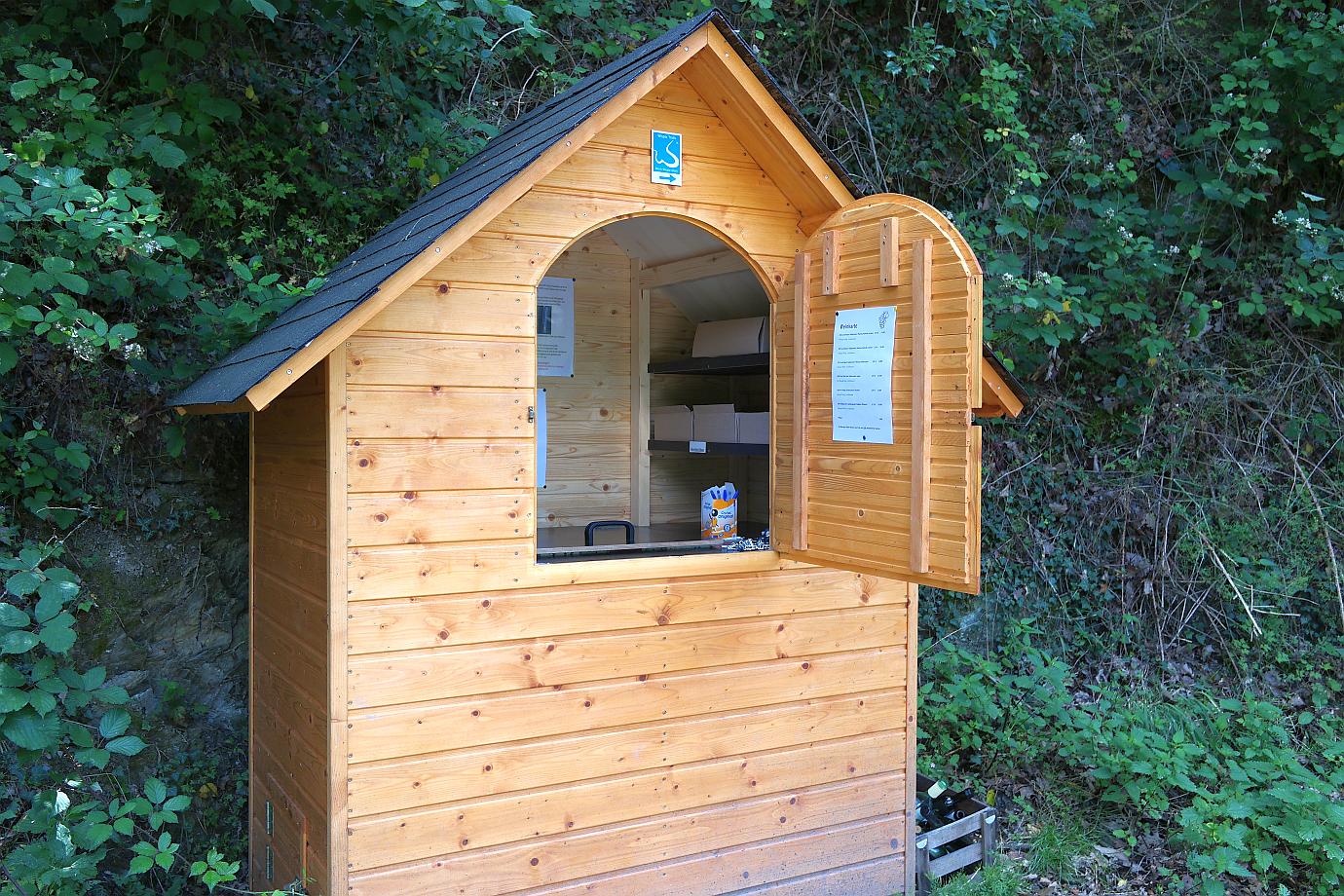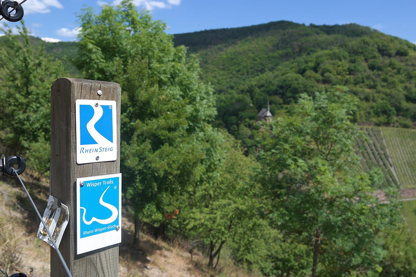 Erfrischt geht es weiter zum nächsten Ziel – Lorchhausen. Der Wanderweg durch die Weinberge hat hier zwei Bezeichnungen: ‚RheinSteig‘ und ‚Wisper Trails – Rhein-Wisper-Glück‘. Vom Rastplatz mit dem Weinfass hat man ebenfalls eine herrliche Aussicht über den Rhein. Dann erreicht man auch schon die Clemenskapelle bei Lorchhausen. Der Weinautomat präsentiert sich als Holzhütte mit einem Kühlfach. Einfach Klappe öffnen und gekühlten Wein mitnehmen – bezahlen nicht vergessen.